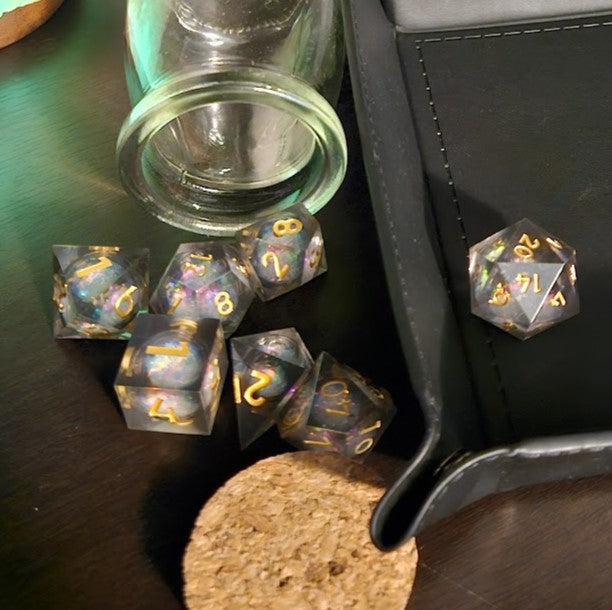 Get lost in the endless expanse of these dice, they reminded us of galaxies far off and away. In our games we are often escaping to other worlds. Whimsical, mysterious, expansive...you know you want these dice to add to your hoard!