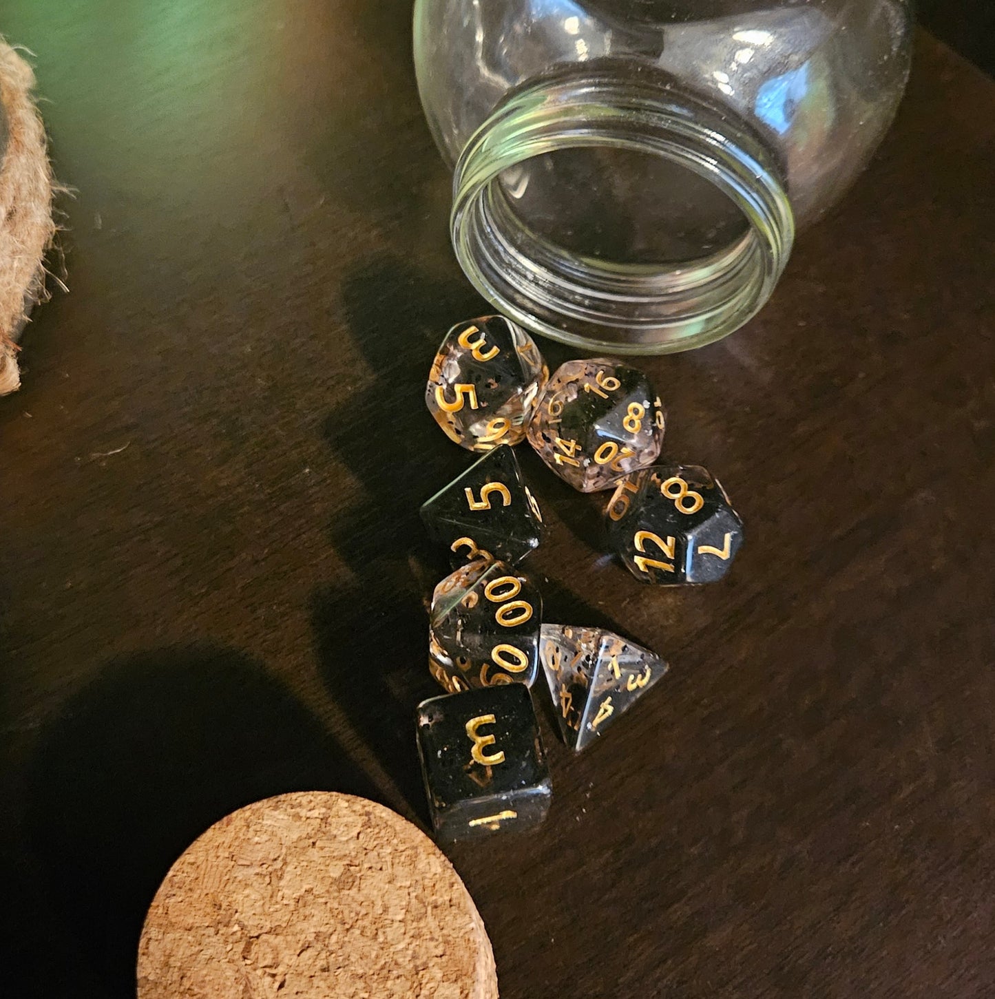 They are clear resin dice with black swirls and black confetti and gold inking. They are 16 mm in size. They roll beautifully and are easy to read. A perfect addition to your collection. It makes game play simple, fun & fast.