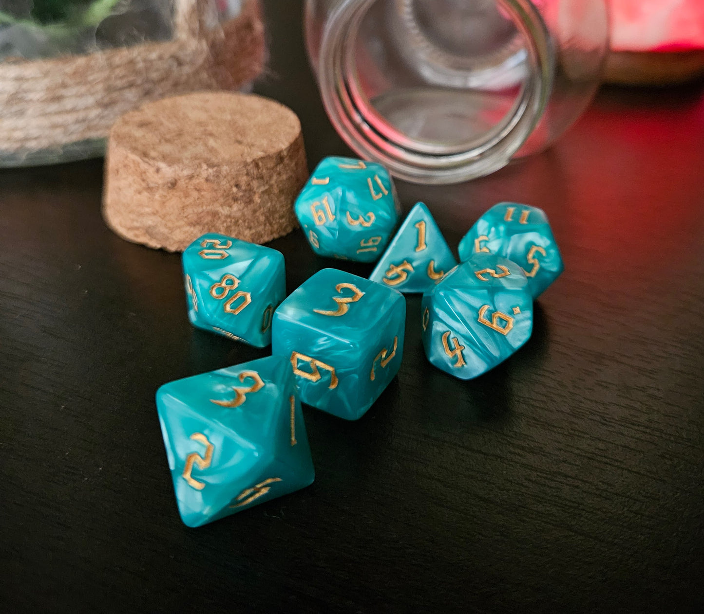 They are very smooth marblized teal green resin dice. They are inked in gold and are 16 mm in size. Smooth to roll and can be read with easily. As usual we do hope these work right into your dice collections and inspire you in your games.