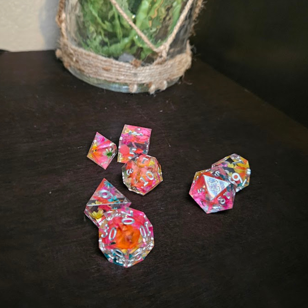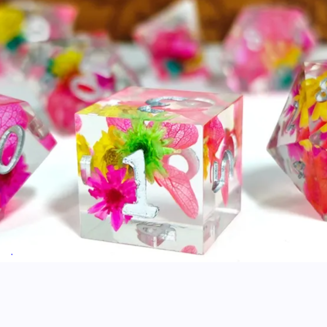 Look at these handcrafted floral inclusion sharp edge dice. They are a clear with colorful flowers inlayed throughout. They are inked in silver and are 16 mm in size. Nicely weighted, durable and easy to use. Perfect for druid characters or any who have a deep love for the earth and the beauty within it. They will help bring forth new life in this season of beautiful new growth and will elevate any gaming experience you use them for. Once again dice that are art + function all wrapped into one. They are perfect for your gaming needs (or to just have insanely awesome dice in your collection).